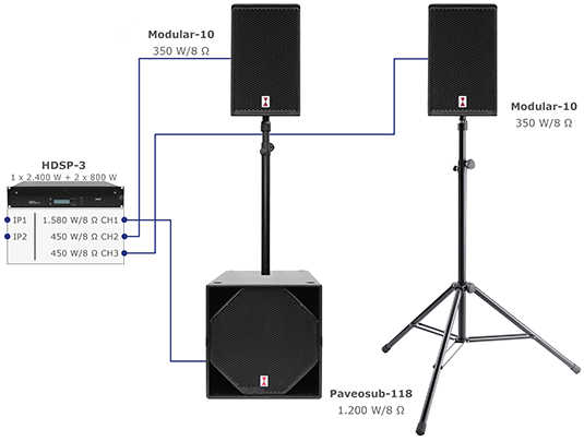 Das SubSat-10 Set besteht aus einem HDSP-3A Verstärker, einem Paveosub 118 und zwei Modular-10.